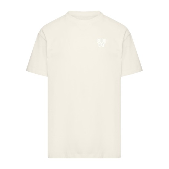Tee designed as an oversize/relaxed fit longline everyday layer with a clean round neckline and short set-in sleeves that sit with a subtly dropped shoulder for an easy silhouette. Cut from a heavy cotton jersey, it feels substantial yet breathable and holds its shape across the chest and hem. A small printed motif at the chest adds a minimal graphic touch while wide sleeves and extended length create effortless layering over trousers or shorts. Neat neckline trim and simple straight hem keep the look pared-back and wearable for daily rotation; machine wash and low?temperature drying are suitable for routine care.