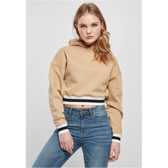 Hoody meets college design ? the result is an absolute must-have piece of fashion! The cropped ladies? hoody presents style-typical striped college cuffs at sleeves and hem as well as a cozy hood. The fit is oversized, with appropriately dropped shoulders. The hoody is made of cotton and polyester.