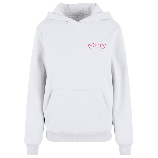 Hoody intended as an everyday layer, offering a relaxed, loose fit and regular length that sits comfortably over jeans or leggings. The cotton-blend fluffy fabric gives a soft, brushed handfeel while holding structure, and long set-in sleeves meet ribbed cuffs and a ribbed hem for clean shaping. A hood neckline and front kangaroo pocket add practical coverage and carry space, while a small chest print of three hearts provides a subtle graphic detail. Constructed for easy layering and casual movement, this hoody works well as a cozy outer layer for cooler days and pairs simply with sneakers or ankle boots.
