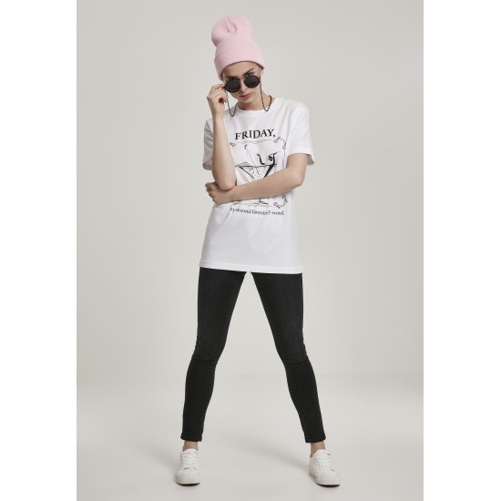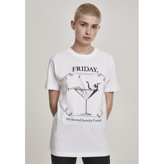 This legendary tee trumps with wit and style alike. On the chest you?ll find a cocktail glass with a lady lolling in it. Around closes a delicately ornamented frame. Above it runs the words "Friday," including "my second favorite F-word." Well, we leave you the guessing, what that word might be!Note: The fitting of this product is adapted to the oversize trend